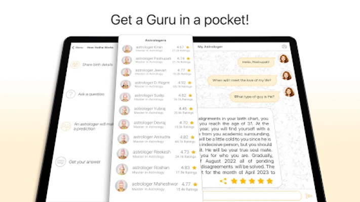 Programu ya Yodha inajivunia kuwa na timu ya wataalamu zaidi ya 300 wa unajimu wa Vedic, Timu ya Yodha, ambao wamejitolea kukupa ushauri wa kweli na wa kina. Wanajimu hawa halisi hufanya utabiri wao kwa kutegemea uchambuzi makini wa chati za kuzaliwa, ishara za zodiaki, mazingira husika, na mambo mengine ya kibinafsi, kuhakikisha usahihi usio na kifani. Maswali yako hayana mipaka; iwe ni kuhusu mapenzi, ndoa, fedha, fursa za biashara, au hata matukio yajayo, utapokea ufafanuzi wa kina. Zaidi ya hayo, pata "Mawazo ya Siku" yenye kusisimua ambayo yanaweza kutoa msukumo chanya na kuboresha kila siku yako.
